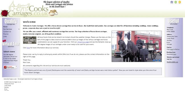 A fast loading clean coded site advertising horse and carriage hire within the Essex area. Consistently maintaining top position in lots of search engines, including google! Now with the addition of 2 * 360 degree virtual tour views of their carriages for hire in their showroom output in the new Flash Player 9 format.