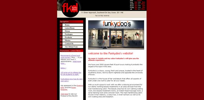 A sophisticated, colourful, smart site for this hair and beauty salon in Southend, Essex. Has price and package pages using a tabbed menu system and includes a series of large, clear, high quality 360 degree virtual tours of each room! Virtual tours are in the QuickTime format.
